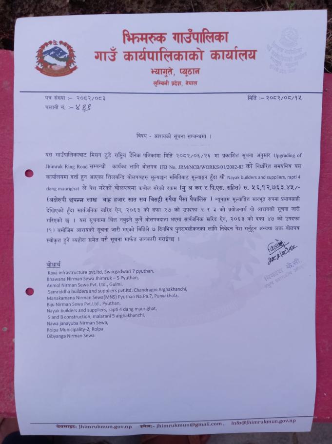 Upgrading of Jhimruk Ring Road को आशयको सूचना ।