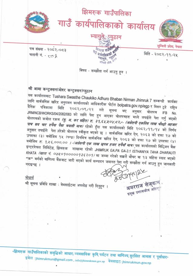 Tushara Swasthe Chaukiko Adhuro Bhaban Nirmal Jhimruk 7 को सम्झौता गर्न आउनु हुन ।