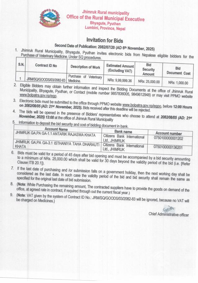 पशु औसधि खरिदको लागी दोस्रो पटक प्रकाशित सूचना ।