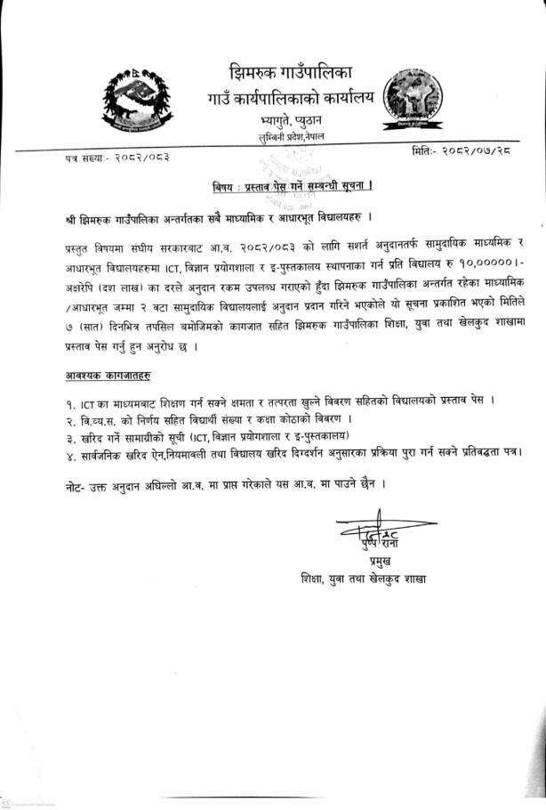 झिमरुक गाउँपालिकाको प्रारम्भिक बातावरणिय परिक्षण प्रतिवेदन तयारीको सार्वजनिक सुनुवाई सम्बन्धी सूचना ।