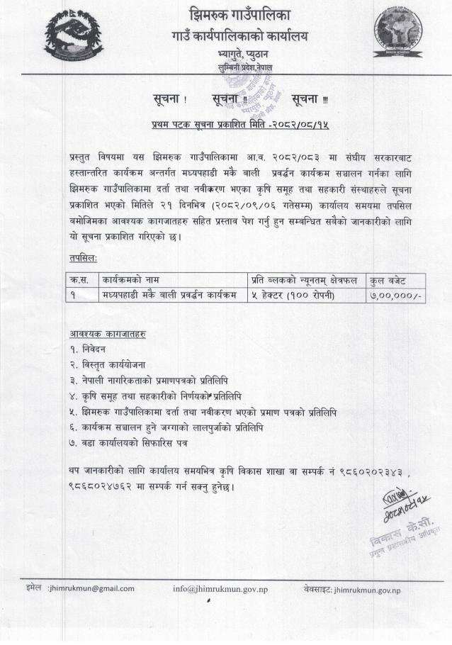 मध्यपहाडी मकै बाली प्रवर्दन कार्यक्रम संचालन सम्बन्धी सूचना ।